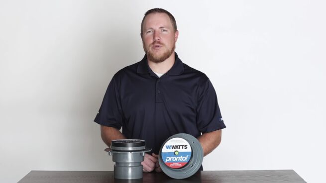 Watts Pronto! (R) CO-1190-PR epoxy coated cast iron floor cleanout with anchor flange, primary and secondary weepholes, post-pour adjustable round heel proof stainless steel cover with integrated bubble level, leveling shims, and no hub (standard) outlet.
