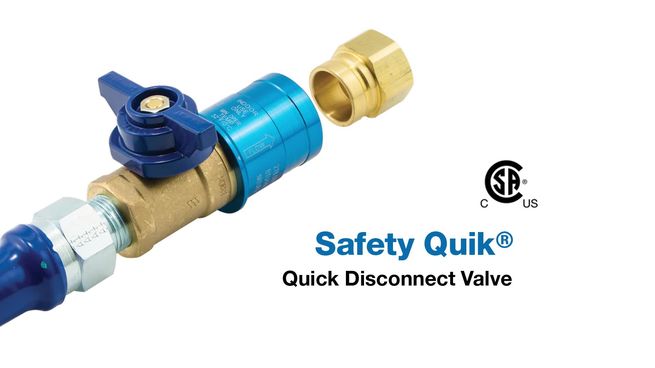 This Safety Quik® quick-disconnect valve combination is designed specifically for the food service industry, meeting the safety and operational needs of commercial kitchens by doing the work of both a quick-disconnect and a valve. With Safety Quik, the gas connector cannot be disconnected until the gas valve is shut off, and cannot be opened until the gas connector is attached.