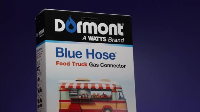 The Dormont® Blue Hose® Food Truck grade gas connector is designed for use with cooking equipment in mobile food preparation vehicles. Fulfills Requirement in IFC 2018 and IFC 2021 for Food Truck Gas Appliance Connections. The gas connector is composed of a 304 stainless steel corrugated tube covered with a tight weave stainless steel braid. The outside hose coating is an antimicrobial PVC coating that inhibits growth of bacteria, mold and mildew, and features built in UV protection. Rotational technology fittings on both ends of the connector rotate 360 degrees, greatly reducing stress at both connector ends. Box contains connector, full port shutoff valve, 2 elbows, and 2 shoulder nipples.