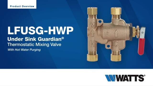 The LFUSG-HWP Under Sink Guardian® 3/8" compression-fitting thermostatic mixing valves maintain and limit hot water to desired selectable temperature between 80°F and 120°F (27°C and 49°C) with flow rates as low as 0.25 gpm (1.0 lpm) and as high as 2.25 gpm (8.5 lpm). This valve features a hot water by-pass lever allowing a hot water sanitization at the point of use fixture. The mixing valve is listed to ASSE Standard 1070 for single fixture applications and IAPMO cUPC. The LFUSG-HWP features Lead Free* construction to comply with Lead Free* installation requirements.